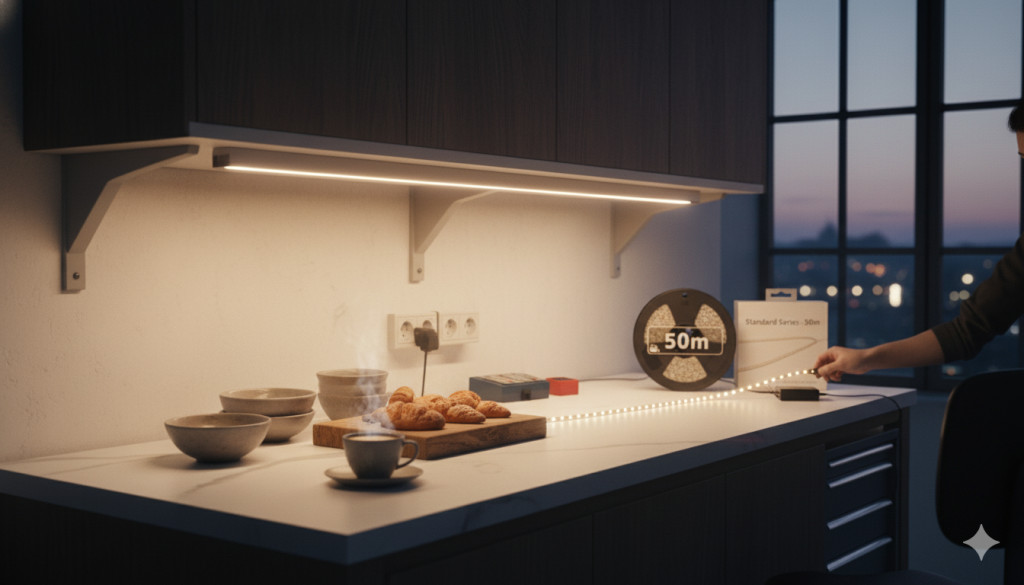 Extrém Kiszerelés (50 méter): Az ipari jellegű 50 méteres tekercs minimalizálja a felesleges toldásokat és csatlakozókat, gyorsítva a szerelést és biztosítva az egységes fényeloszlást a teljes szakaszon.
